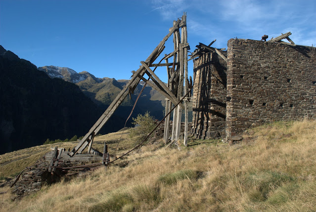 Blijf op een afstand van Cabane Plan en loop in eerste instantie naar een bouwsel dat vermoedelijk ooit een pyloon is geweest van een kabelbaan voor het transport van erts en werk me langzaam naar Coma d’Arbe.